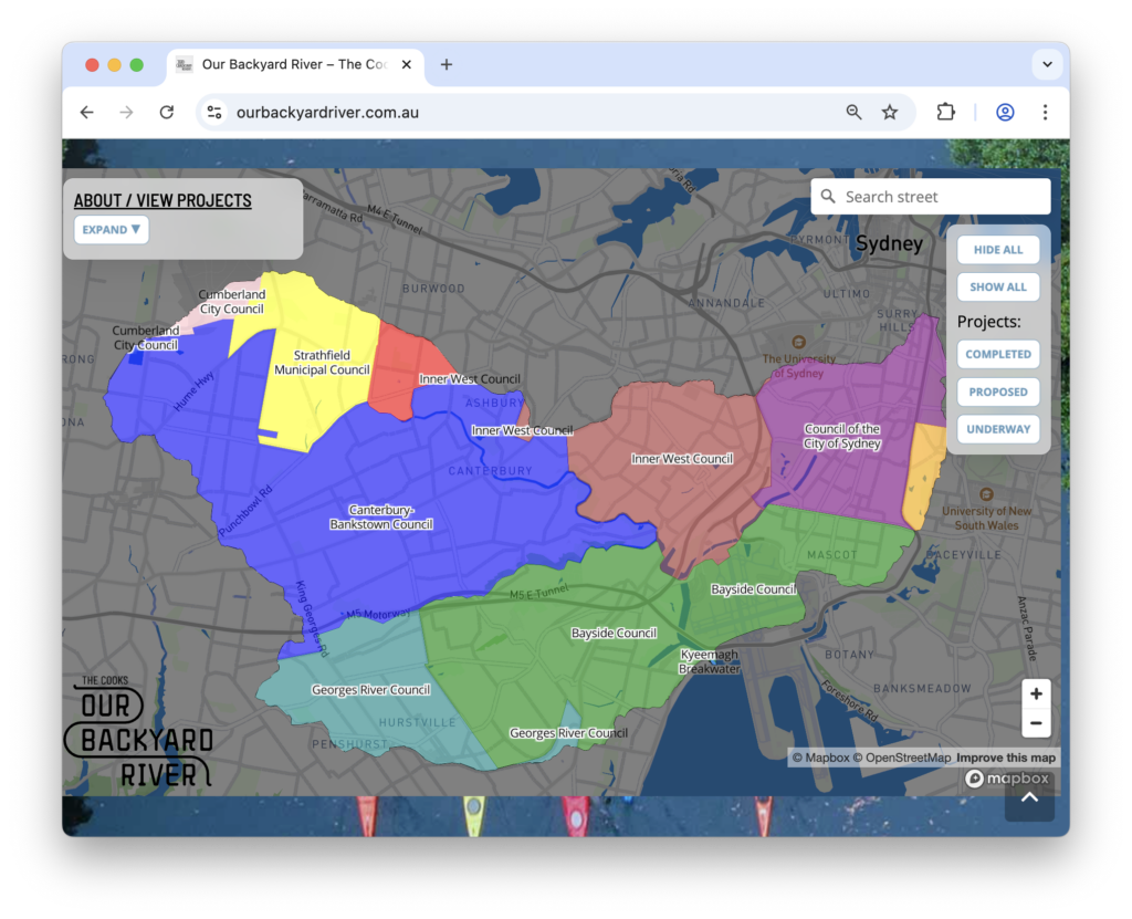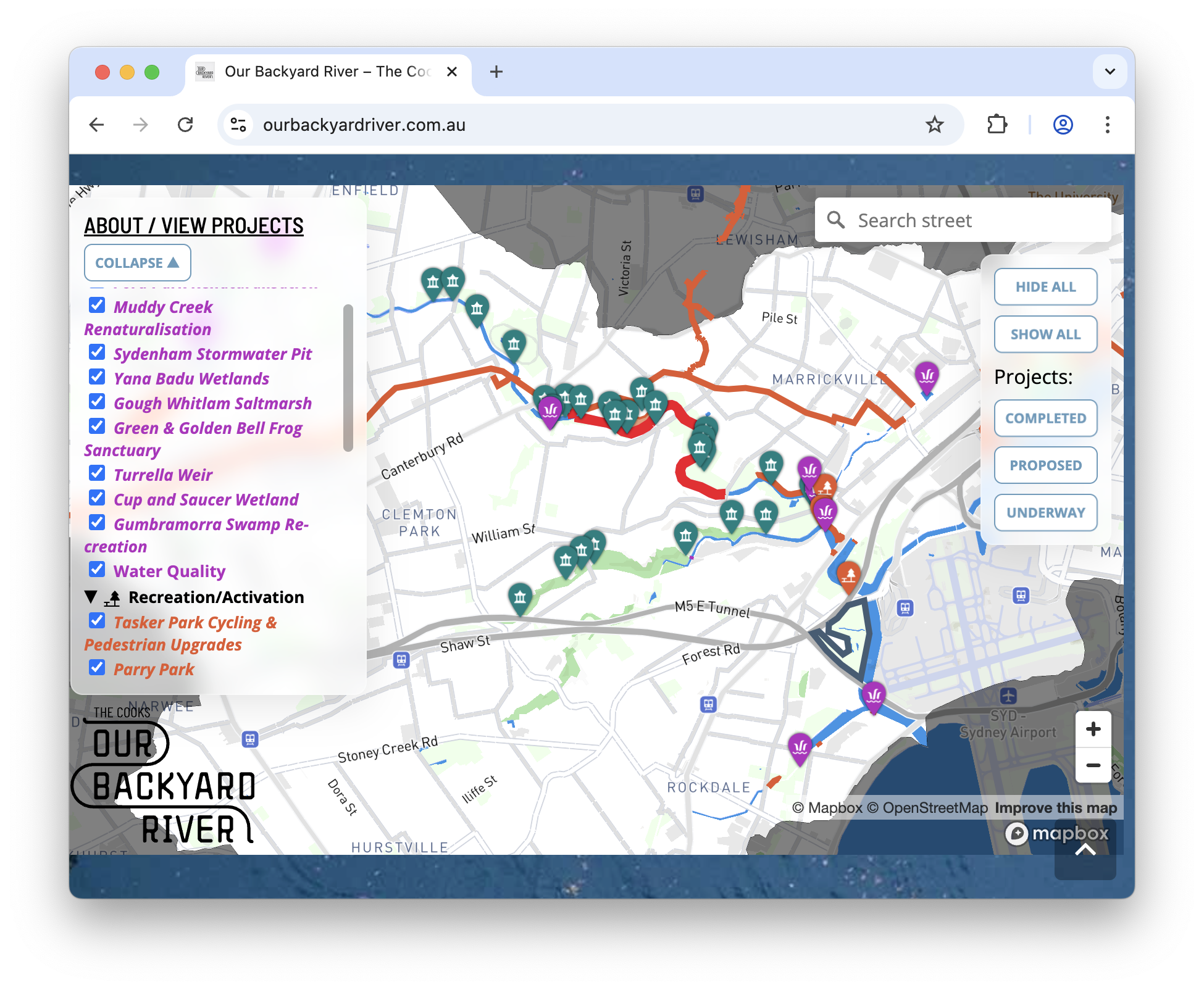 The Cooks River Catchment Map is a user-friendly interactive map, designed to maximise the visibility, accessibility and accountability of improvements in the Cooks River catchment.