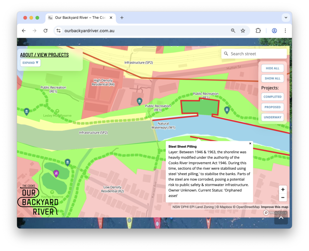 The map also visualises the extent of the sheet steel piling along the river, which has been a significant focus of the community and was extensively discussed at the recent forum hosted by the Cooks River Catchment Community Collective in November 2025.